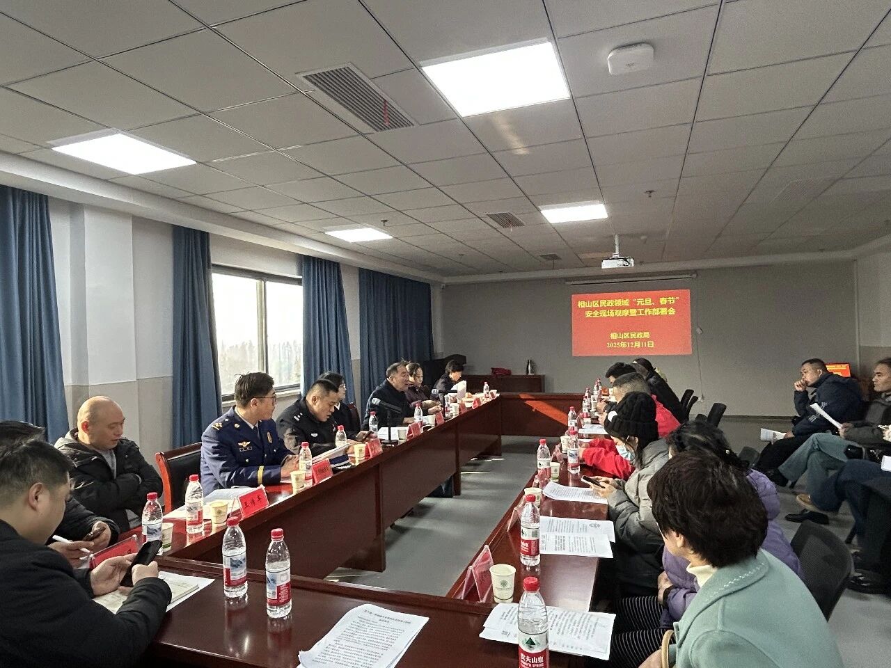 2025年12月11日上午,为深入贯彻落实上级关于安全生产工作的系列重要指示精神,深刻汲取各类安全事故教训,全面排查整治民政服务机构安全风险隐患,切实保障服务对象生命财产安全和身体健康,确保在院老人度过一个安宁、祥和的节日。淮北市相山区于淮北中健淮旅康养中心召开了民政领域“元旦、春节”安全现场观摩暨工作部署会。