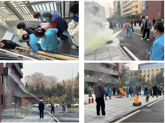 随后,现场开展应急逃生实战演练及失能老人救援。区民政局局长杨春华宣布演练开始后,工作人员讲解逃生实战演练,点燃烟雾弹,消控室警报响起、用广播宣布人员疏散,由区领导分开先下楼梯,自理老人、半失能老人、全失能老人在护工的帮助下延两处楼梯疏散,护工最后抬全失能老人(假人)担架疏散。楼北侧中间疏散通道外设置引火物燃烧,用东西两侧消火栓灭火。